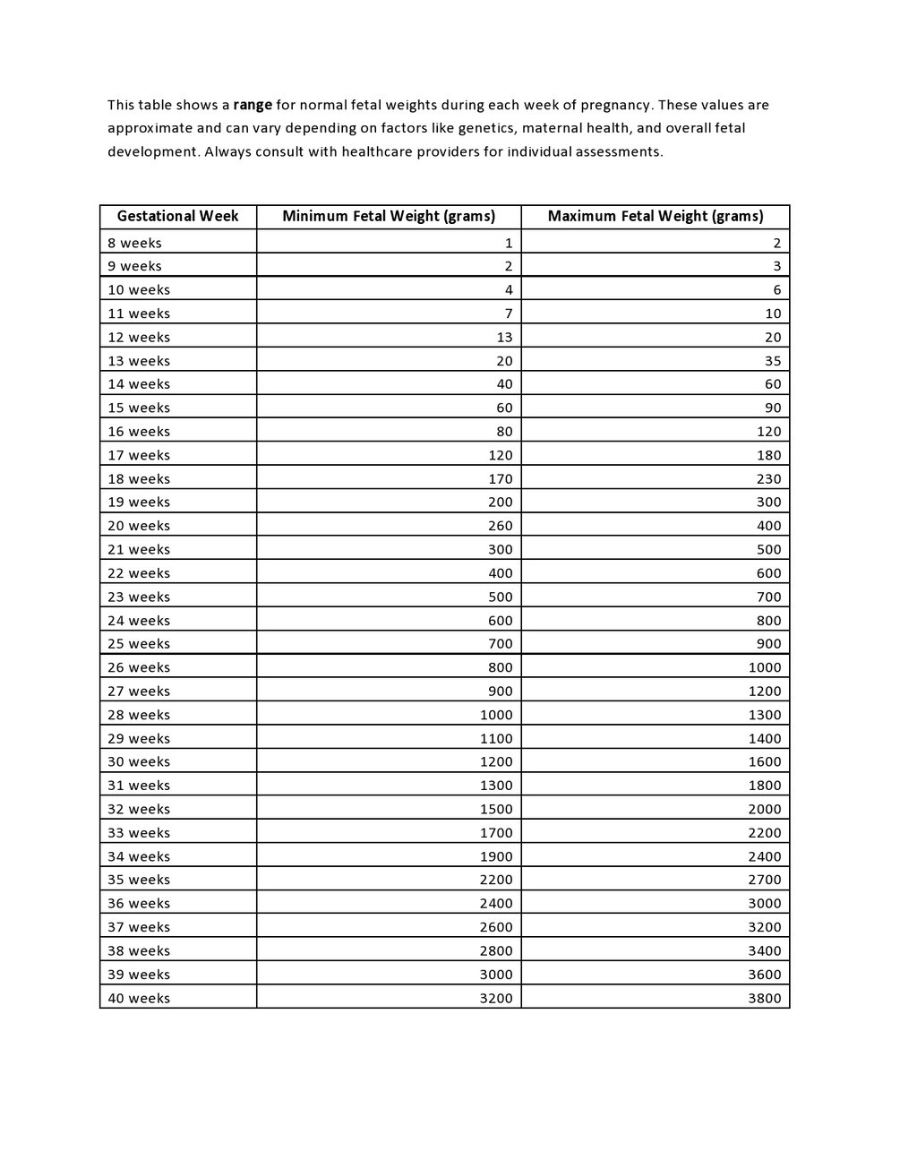 This blog post provides a comprehensive week-by-week table of normal fetal weight, including the minimum and maximum ranges. It explains.